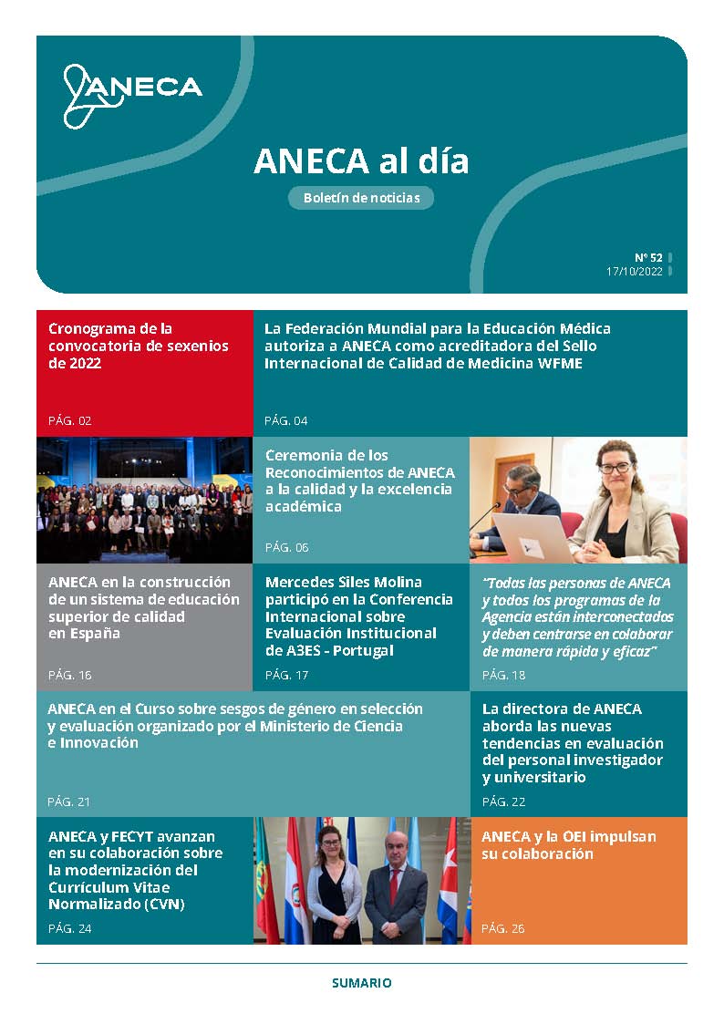 Cronograma de la convocatoria de sexenios de 2022 - La Federación Mundial para la Educación Médica autoriza a ANECA como acreditadora del Sello Internacional de Calidad de Medicina WFME - Ceremonia de los Reconocimientos de ANECA a la calidad y la excelencia académica - Acreditación institucional de centros de las universidades de Oviedo, Pública de Navarra,  Extremadura, Murcia y Europea de Canarias - ANECA en la construcción de un sistema de educación superior de calidad en España - Mercedes Siles Molina participó en la Conferencia Internacional sobre Evaluación Institucional de A3ES – Portugal - “Todas las personas de ANECA y todos los programas de la Agencia están interconectados y deben centrarse en colaborar de manera rápida y eficaz” - ANECA en el Curso sobre sesgos de género en selección y evaluación organizado por el Ministerio de Ciencia e Innovación - La directora de ANECA aborda las nuevas tendencias en evaluación del personal investigador y universitario - Reunión de la Comisión Mixta EUROINF, EUROLABEL y SIC MEDICINA del Programa de Sellos Internacionales de Calidad - ANECA y FECYT avanzan en su colaboración sobre la modernización del Currículum Vitae Normalizado (CVN) - ANECA participa en la Comisión Ejecutiva de SIACES - ANECA y la OEI impulsan su colaboración - ANECA y la Universidad de Especialidades Espíritu Santo de Ecuador comparten experiencias innovadoras en la enseñanza superior