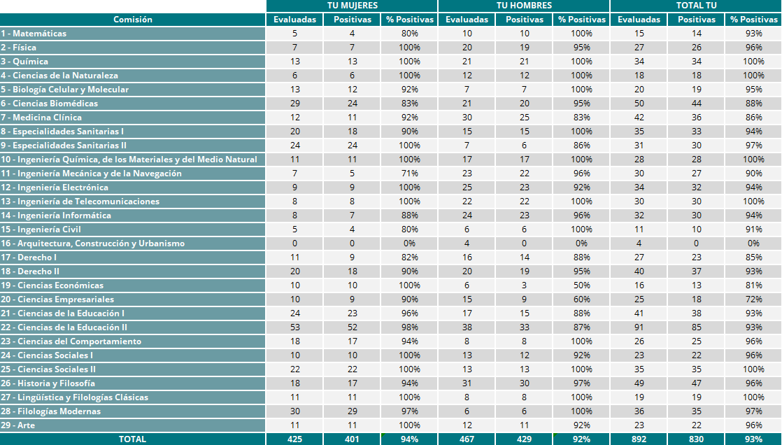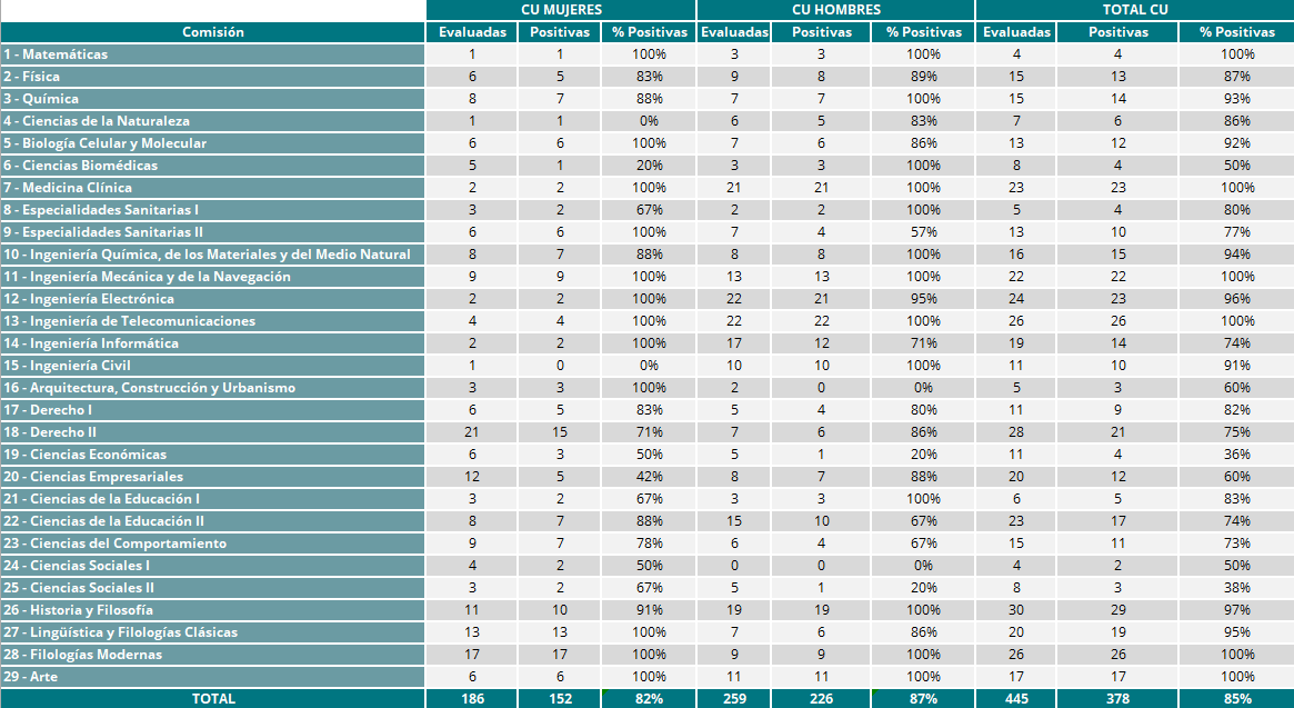 El 85% de los informes de Catedrática/o de Universidad ha sido positivo, así como el 93% de Titular de Universidad