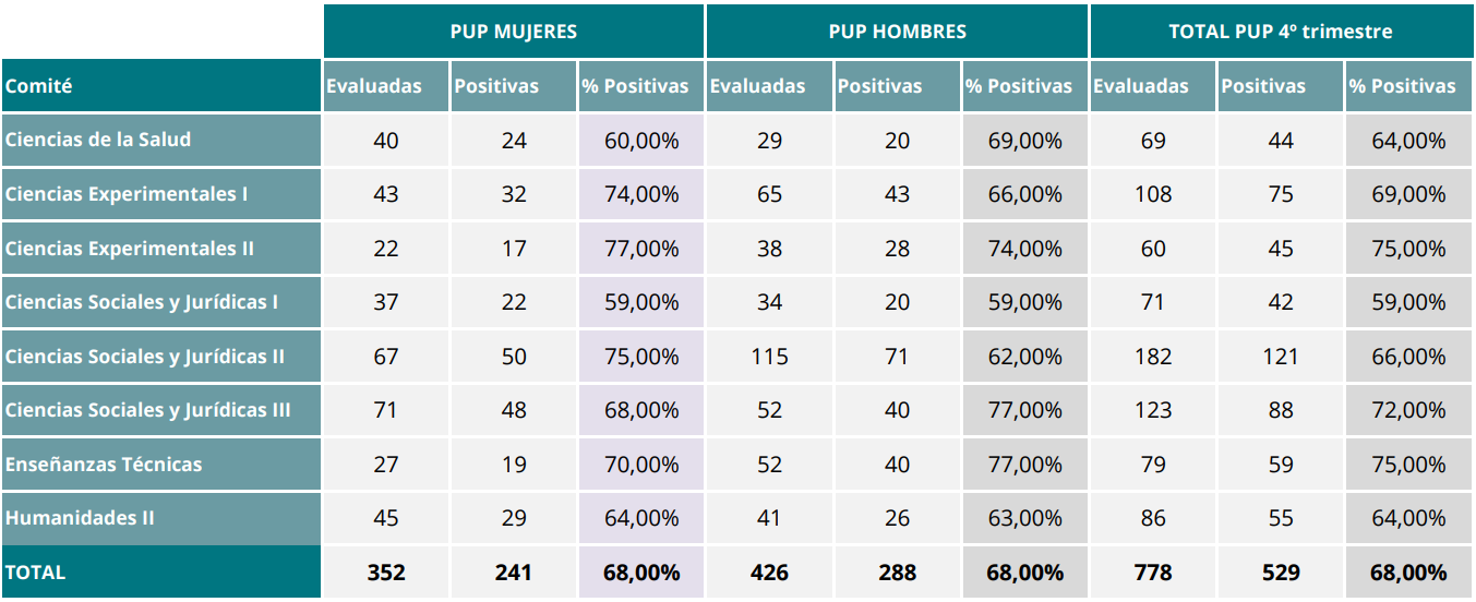 Por otro lado, se ha mantenido un periodo medio de resolución aproximadamente de tres meses, siguiendo el compromiso asumido por la dirección de ANECA. Además, tanto en el caso de PCD como en el de PUP, el porcentaje de resoluciones positivas ronda el 70%.