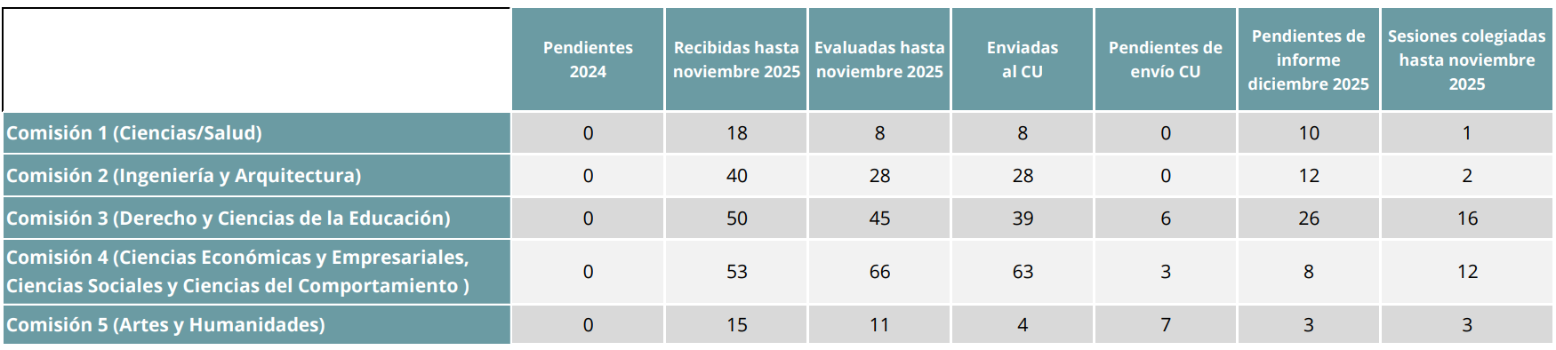 A día de hoy, ninguna de las comisiones tiene informes pendientes de 2024. La previsión de las comisiones 1, 2, 4 y 5 es terminar en diciembre los informes solicitados por el Consejo de Universidades. La comisión 3 sigue siendo la que más reclamaciones debe revisar, lo que explica que tenga también más pendientes de informe a pesar de todas las reuniones celebradas.
