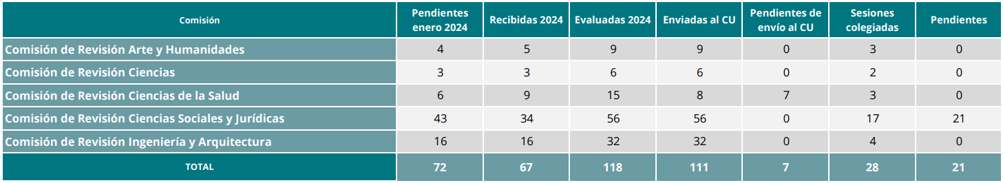 La nueva comisión de Ciencias Sociales y Jurídicas, con 43 reclamaciones pendientes de informe en enero de 2024, ha emitido ya 56 en las 17 sesiones colegiadas celebradas desde su constitución. A fecha de hoy tiene 21 reclamaciones remitidas por el Consejo de Universidades pendientes de informe.